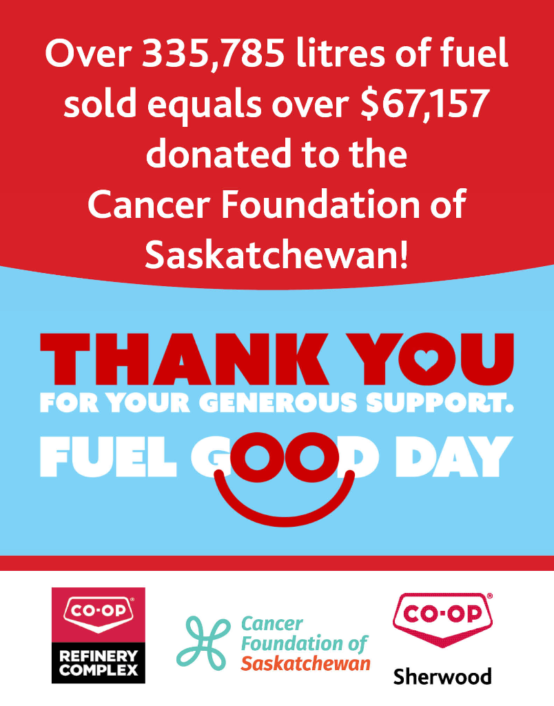 Tuesday was another fantastic day at the pumps! As always, we have the best members around who continue to enthusiastically support our charitable initiatives like Fuel Good Day. We sold a total of 335,785 litres, which means Sherwood and Co-op Refinery Complex will donate $67,157 to the Cancer Foundation of Saskatchewan!!